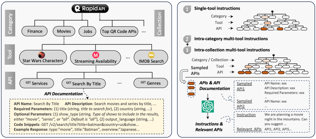 API 爬取 :作者从 RapidAPI Hub 上收集了大量真实多样的 API。RapidAPI 是一个行业领先的 API 提供商,开发者可以通过注册一个 RapidAPI 密钥来连接各种现有 API。所有 RapidAPI 中的 API 可以分为 49 个类别,例如体育、金融和天气等;每个类别下面有若干工具,每个工具由一个或多个 API 组成