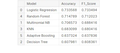 ,'KNN','Random Forest','Adaptive Boosting']) tbl['Accuracy']=pd.Series([acc_lr_tf,acc_nb_tf,acc_dt_tf,acc_knn_tf, acc_rf_tf,acc_ab_tf]) tbl['F1_Score']=pd.Series([f1_lr_tf,f1_nb_tf,f1_dt_tf,f1_knn_tf, f1_rf_tf,f1_ab_tf]) tbl.set_index('Model') # Best model on the basis of F1 Score tbl.sort_values('F1_Score',ascending=False)
