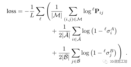 真值匹配M是在两个图像中具有低重投影误差和一致深度的点对。当一些点A和B的重投影或深度误差与所有其他点足够大时,它们被标记为不可匹配。然后最小化在每一层预测的分配的对数似然性ℓ, 推动LightGlue尽早预测正确的对应关系: