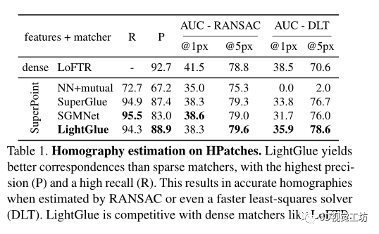 从结果来看,LightGlue比SuperGlue和SGMNet有着更高的精度和相似的召回率,当使用DLT估计单应性时,这导致比使用其他匹配器更准确的估计。因此,LightGlue使DLT这样一个简单的求解器达到了与昂贵且较慢的MAGSAC相比的竞争力。在5px的粗略阈值下,LightGlue也比LoFTR更准确。