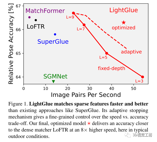 可以说,这个LightGlue是SuperGlue的加强版本,相比于SuperGlue,在内存和计算方面更高效,同时结果更准确,也更容易训练,SuperGlue是在其之前性能最好的特征匹配算法。