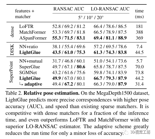 结果来看,LightGlue达到了与SuperGlue类似的精度,但时间少2.5倍。