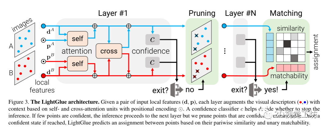 在每个层的末尾,LightGlue推断每个点预测分配的置信度: