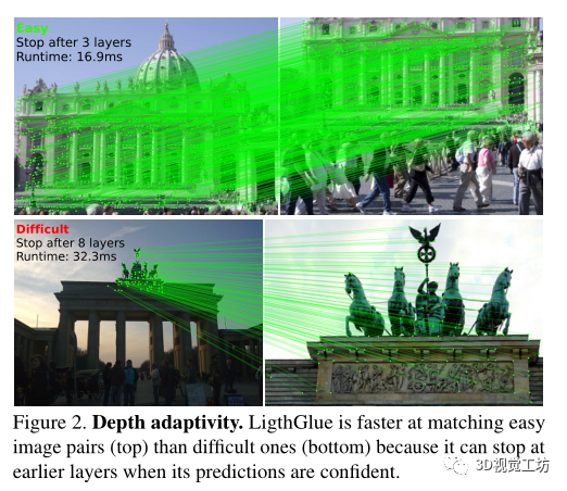 LightGlue通过适应每幅图像的难度来决定什么时候退出推理。图像匹配的难度取决于两幅图像视觉重叠度、外观变化程度。在直观上容易匹配的图像对上推理比在具有挑战性的上要快得多,这是通过在每个计算块之后预测一组对应关系使模型能够预测是否需要进一步计算来实现最终目的。LigthGlue也会在早期阶段丢弃不可匹配的点,从而将注意力集中在共视区域。