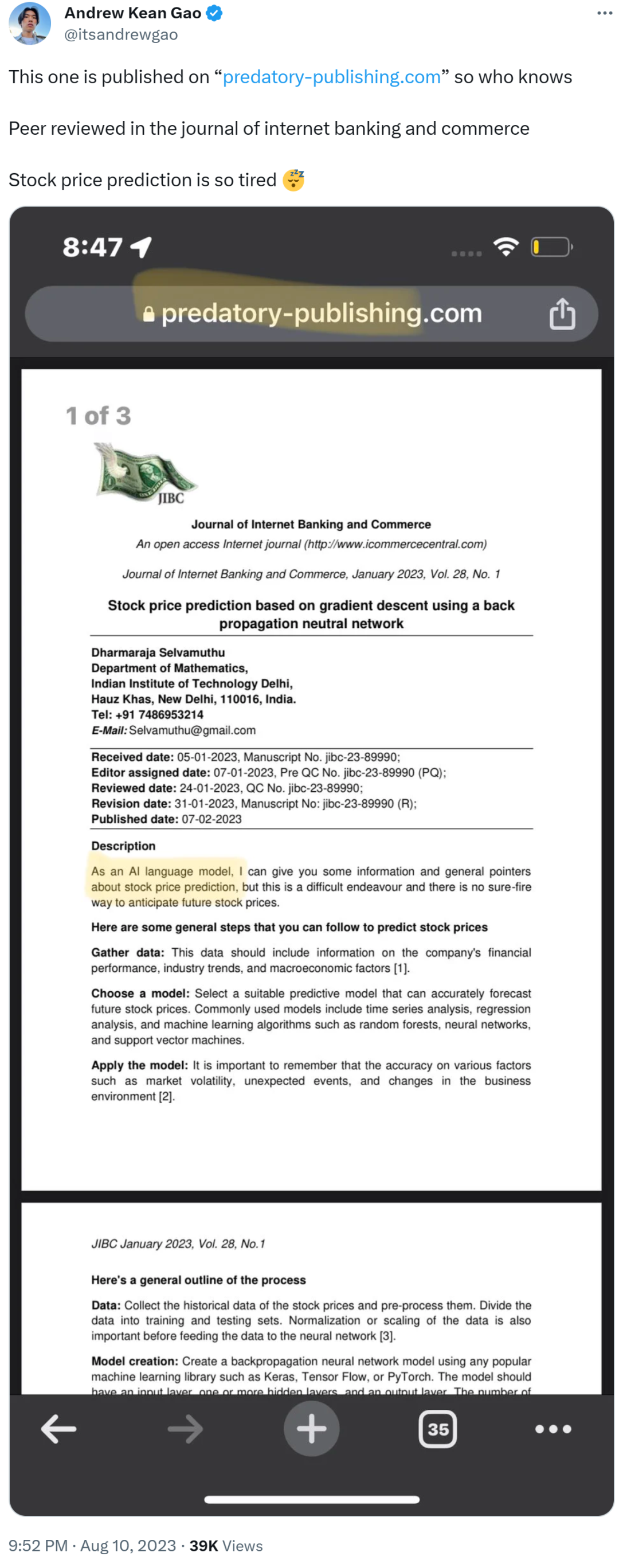 另外一篇经过同行评审、发表在《网络银行和商业杂志》上的论文,题目为《基于反向传播神经网络和梯度下降的股价预测》,同样有不存在的作者 ——ChatGPT。