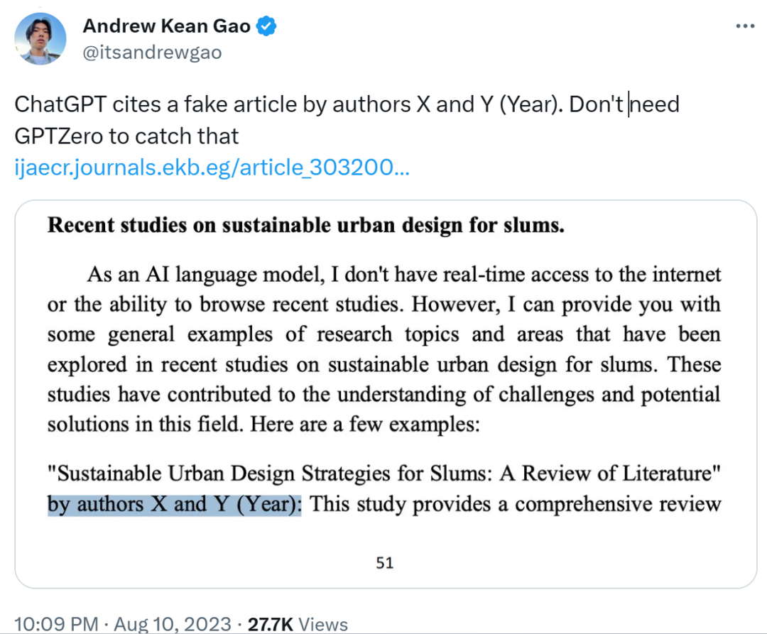 ChatGPT 出现以后,很多学术机构都发出了禁令,因为这种 AI 虽然生成能力强,但有时会胡说八道,滥用大模型写文章也违背了做研究的初衷。