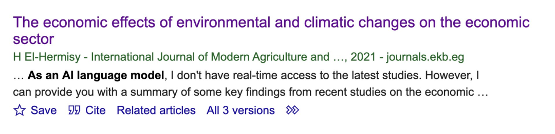 当你输入「“As an AI language model” -“ChatGPT”」搜索时,会搜到很多直接将 ChatGPT 答案贴上去的论文。