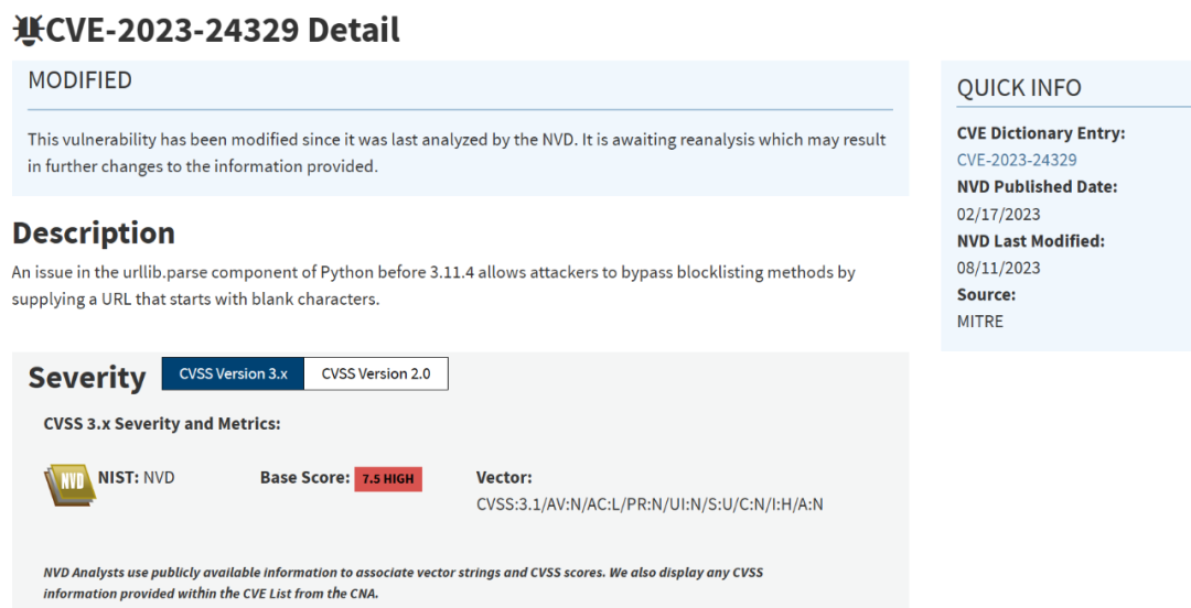 该漏洞的编号是 CVE-2023-24329,CVSS 评分为 7.5。安全研究员 Yebo Cao 在 2022 年 8 月发现并上报了这个漏洞。