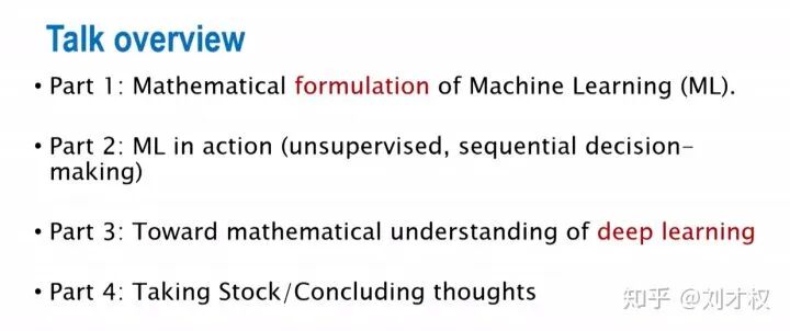 有了基础的《 概率/统计》 、《 线性代数》 、《微积分》知识,就可以上手深度学习的算法和实践了。但经过一段时间的工程实践,慢慢觉得大多数时间都用在选模型,调超参,或者是网络结构的排列组合上。深度学习的黑盒特性越来越明显。难道深度学习工程师就当真是数据“炼丹师”吗? 如果,你有了这样的感觉,下面的视频不妨抽时间看看(都需要翻墙): 李宏毅《Machine Learning and having it deep and structured》 不多说,直接看目录吧。 课程地址: http://speech.ee.ntu.edu.tw/~tlkagk/courses_MLDS18.html 《Theory 1 - Why Deep Structure》 Can shallow network fit any functionPotential of Deep Is Deep better than Shallow 《Theory 2 - Optimization》 When Gradient is ZeroDeep Linear Network Does Deep Network have Local Minima Geometry of Loss Surfaces (Conjecture) Geometry of Loss Surfaces (Empirical) 《Theory 3 - Generalization 》 Capability of GeneralizationIndicator of Generalization Sanjeev Arora《 The mathematics of machine learning and deep learning 》 视频地址: https://www.youtube.com/watch?v=r07Sofj_puQ 这是ICM2018的主题演讲,虽然Sanjeev Arora作为普林斯顿计算机科学的教授,但演讲内容深入浅出,并没有涉及大量的数学公式和推导,这里贴一下提纲: 小结 这两部分的内容是相互呼应的,可以先看李宏毅老师的课程,然后在看Sanjeev Arora教授的分享总结。 作者:润宁