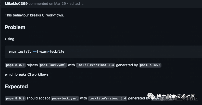 这个问题的原因呢,大概就是这两个版本之间的 lockfile 不兼容,我们可以看到 gayhub 中有个老铁的评论(详细了解大家戳:https://github.com/pnpm/pnpm/issues/6307 这个地址):