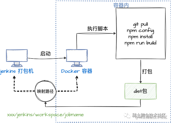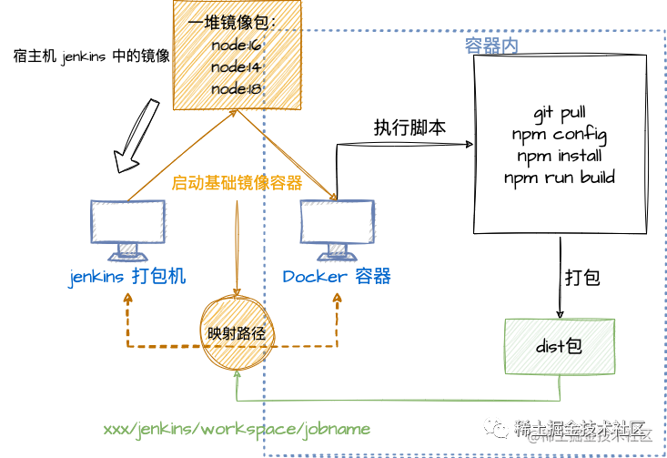 ❝以至于我为什么要做路径映射,这是因为目前「部署实现」是在 jenkins 的 workspace 中拿到产物去部署的,所以我要保证改在容器内构建后,「宿主机的 workspace 中依然有产物 dist」。(这一块因场景不同会有不同的做法,我就不深入展开了)