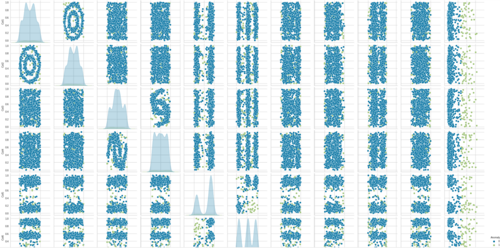 接下来是第三种模式。线性离群因子,我们可以用一个不同的图来实验,创造一个2D图。我们可以放大这个二维图来查看哪些点被认为是异常值。可以再次为配对图创建另一个视觉效果,现在使用异常来查看哪些点将被视为异常。sns.pairplot(lof_results, hue = "Anomaly")