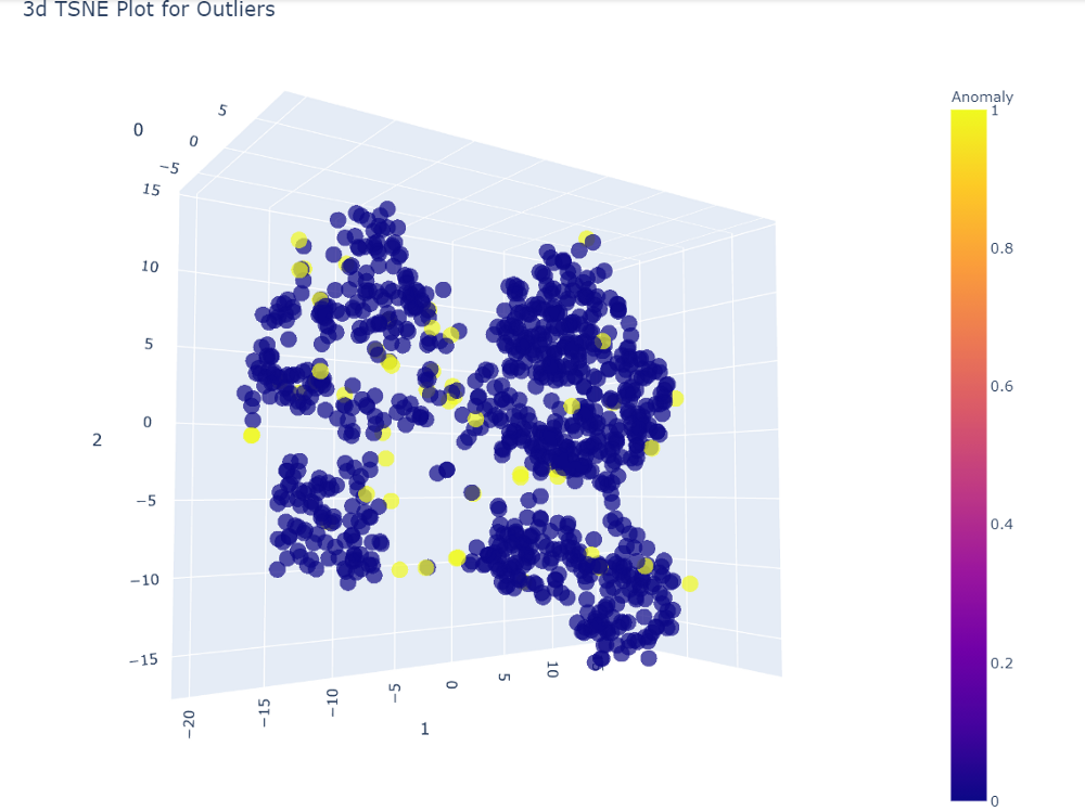 我们可以看到,隔离森林在多个维度上确定的大多数异常通常来自不同的集群。现在在PyCaret 中为 KNN使用plot_model() 函数,它将为异常值创建一个 3D 图,在其中我们可以看到为什么某些特征被视为异常。我们可以在任何维度上移动它以查看和指出异常。这个 3D 绘图有助于我们更好地查看它。KNN 图显示大多数异常值是那些不属于任何集群的异常值。所以这很好!很明显,数据集被分成了四个不同的集群,所以这些组之外的任何东西都肯定是异常的。异常并不总是坏兆头!有时它们在解释结果或数据分析方面非常有用。这些可用于解决不同的数据科学用例。