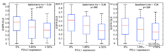 EGFR-DLS与PD-L1表达水平之间存在较强且显著的相关性(三个子图分别为训练、验证和测试三个子队列)。