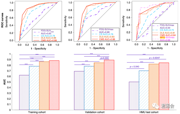 此外,为了比较EGFR-DLS和临床变量及其互补性, 作者还使用临床变量构建了clinical signature(CS),以及二者结合的combined signature(CMS)。构建方法为训练集上对自变量进行logistic regression(标签仍为预测EGFR突变),之后取模型输出作为signature。