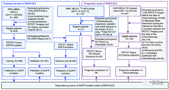 本文基于NSCLC的PET/CT影像,开发了用于预测EGFR突变状态的深度影像标志物EGFR-DLS,并验证了其对病人预后的指示作用和辅助选择治疗方案的能力