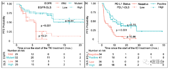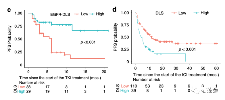 EGFR-DLS可以显著区分接受靶向(图c)或免疫治疗(图d)病人的预后。