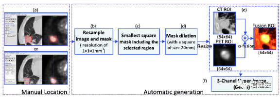PET和CT首先使用ITK-SNAP软件(version 3.6.0)进行配准,之后由3位经验丰富的放射科医生完成ROI区域标注,再进行膨胀处理以包括肿瘤周围区域。最后缩放到64x64像素用于模型输入。