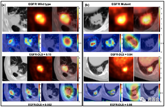 注2:由于18F-MPG图像反映了肿瘤EGFR突变的情况,因此预测模型关注的区域和MPG图像热点区域一致说明了模型从影像上捕捉EGFR突变信息的有效性。
