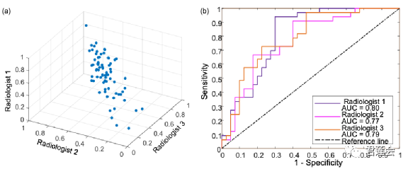 根据三位放射科医生标注计算出的EGFR-DLS差别不大(图a,每个坐标轴为一位医生标注计算得到的DLS,三组DLS构成了一个三维坐标系,数据点分布在立方体的主对角线说明了三组DLS的一致性较好),且基于三组EGFR-DLS预测EGFR突变的效果相近(图b)。以上结果说明了算法对肿瘤区域标注的鲁棒性。