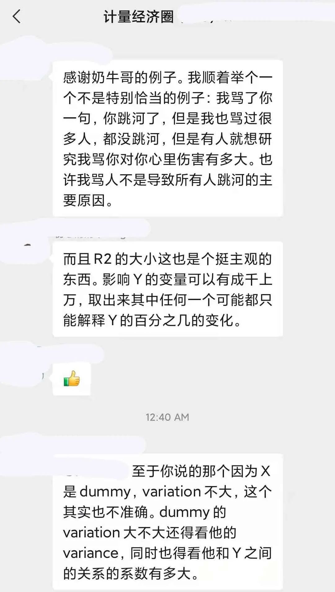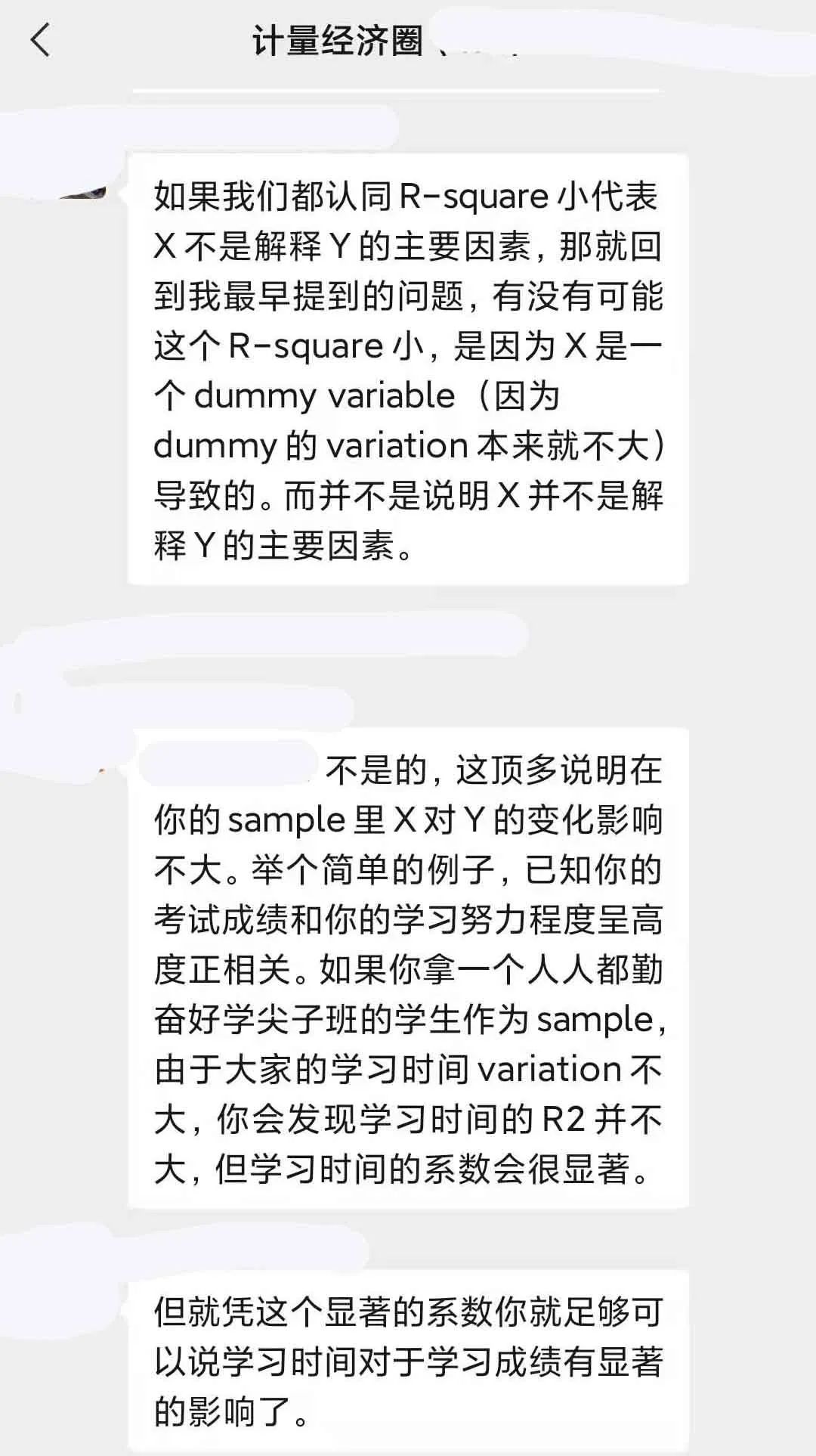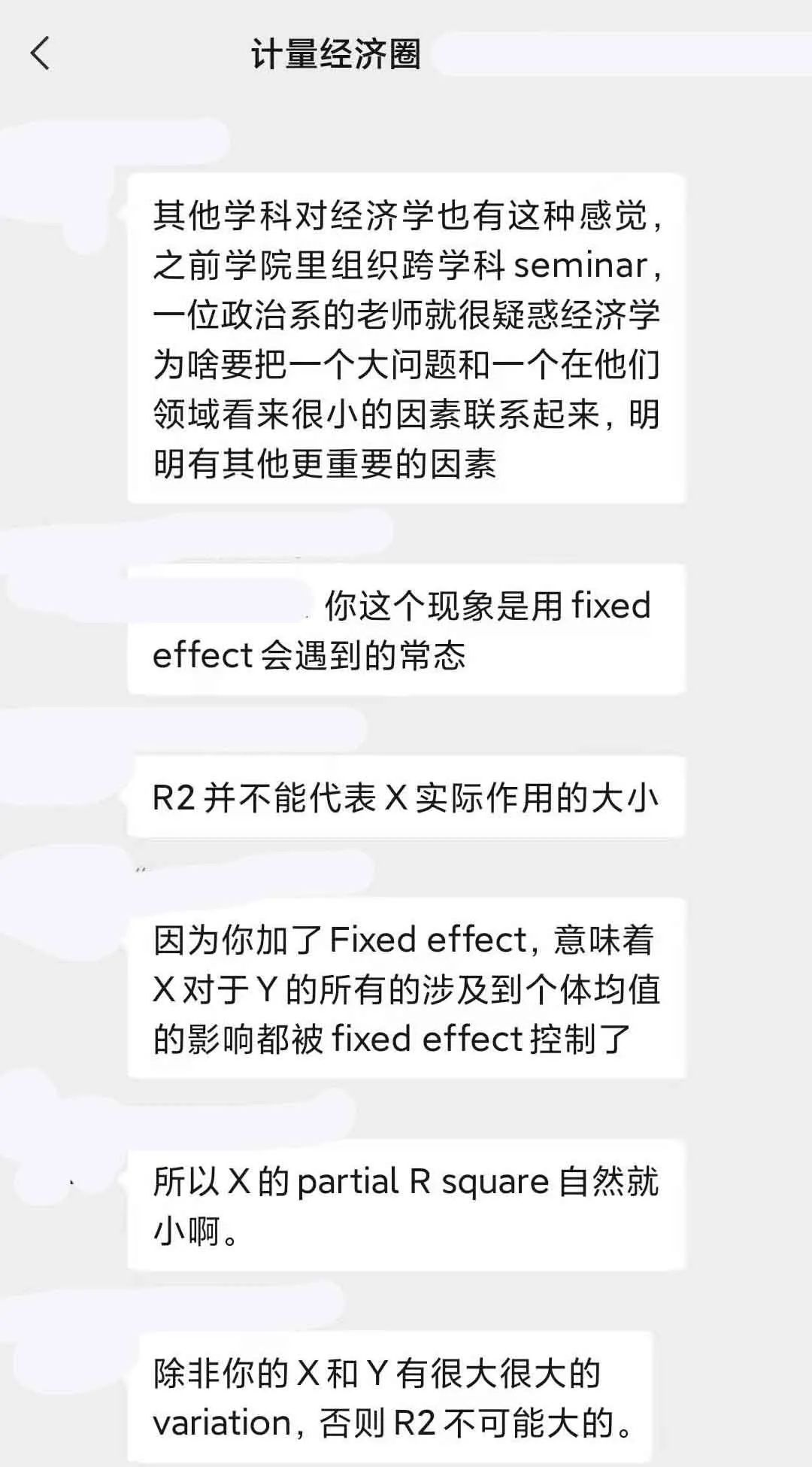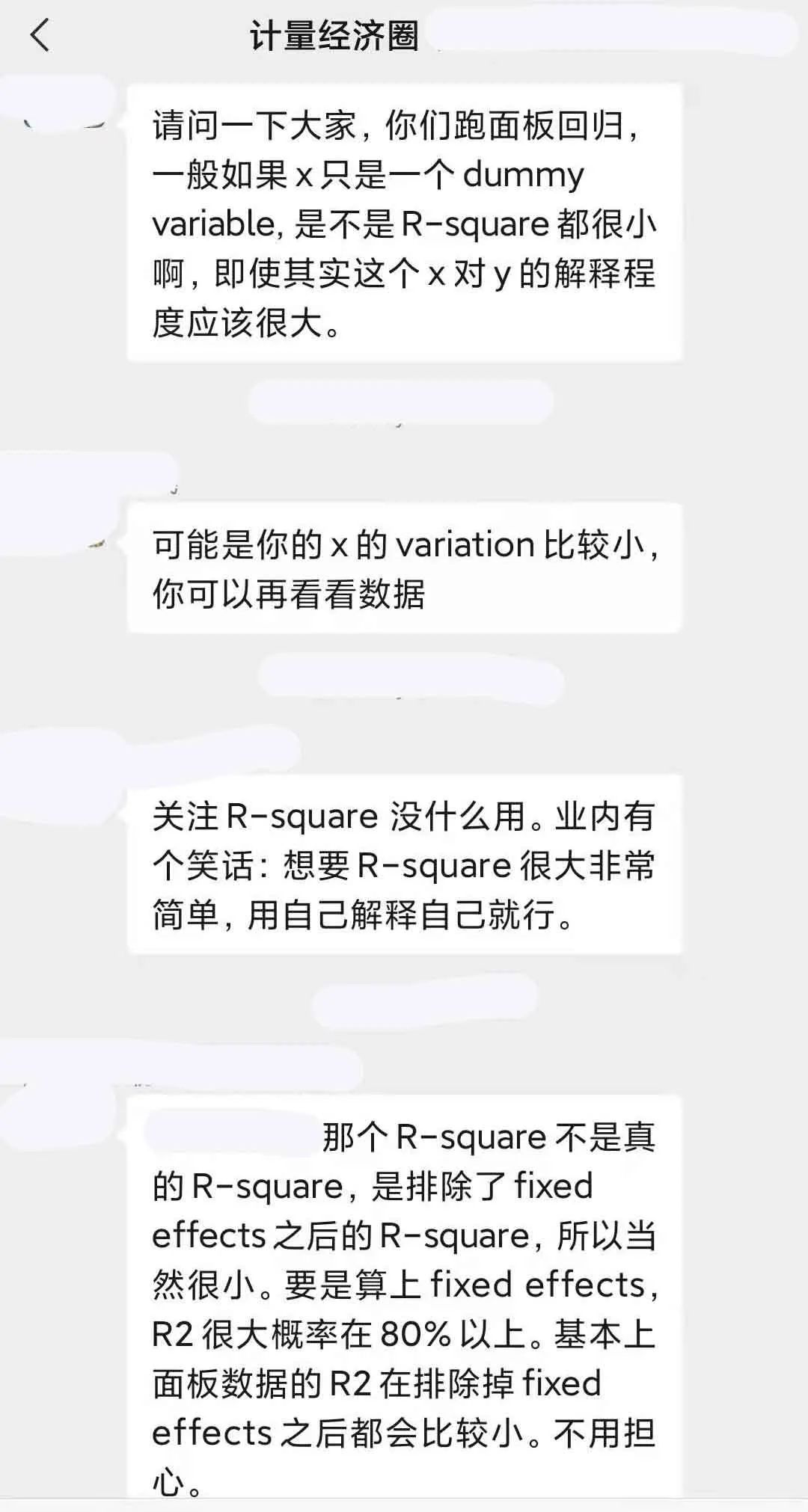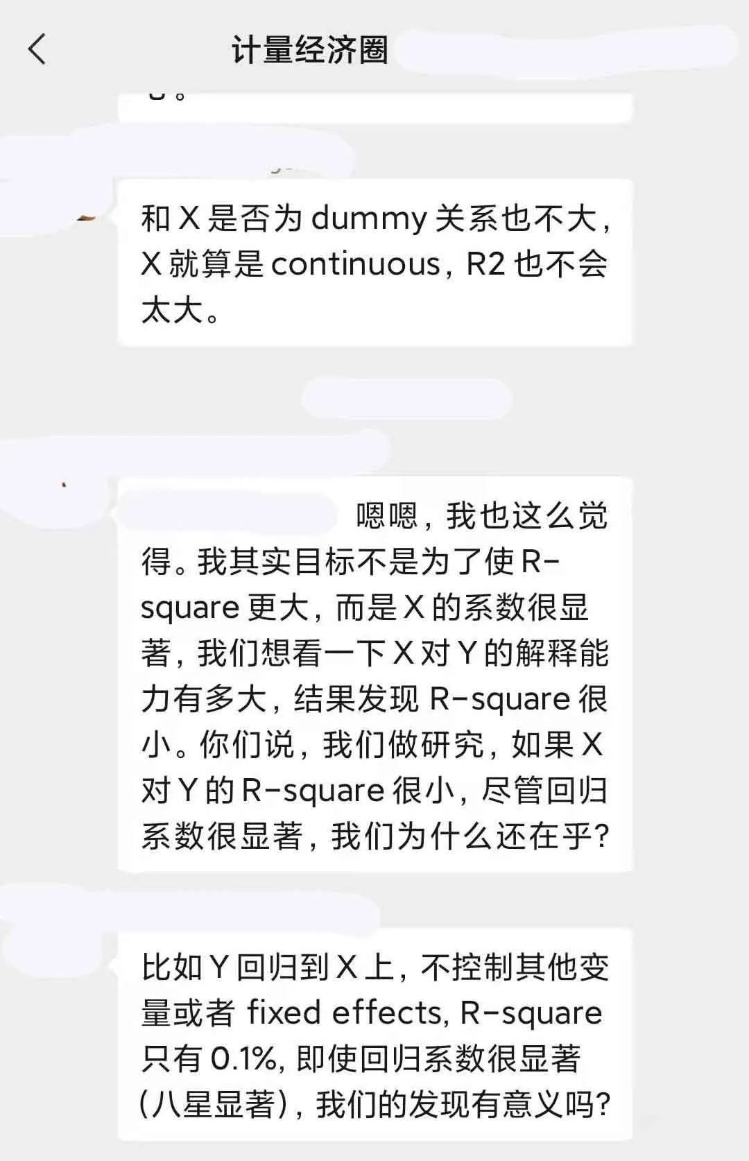 一些社群学术讨论:1.“显著不显著的后背是什么, 非(半)参估计里解决内生性”,2.“计量社群里关于使用交互项还是中介效应分析开展机制研究的讨论”,3.“为啥面板数据回归中, 即使X对Y的解释程度很大, 但R-square一般都很小?”,4.多期DID中使用双向固定效应可能有问题! 又如何做平行趋势检验? 多期DID方法的最新进展如何?,5.收入和年龄等变量是将其转化成有序离散变量还是当成连续变量进行回归呢?6.控制变量就能影响结果显著性, 所以存在很大操作空间, 调参数是常用手段吗?