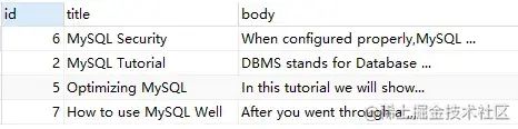 -- 当使用 Query Expansion 模式查询 SELECT * FROM `fts_articles` WHERE MATCH(title,body) AGAINST('database' WITH QUERY expansion);使用 Query Expansion 后查询结果如下: