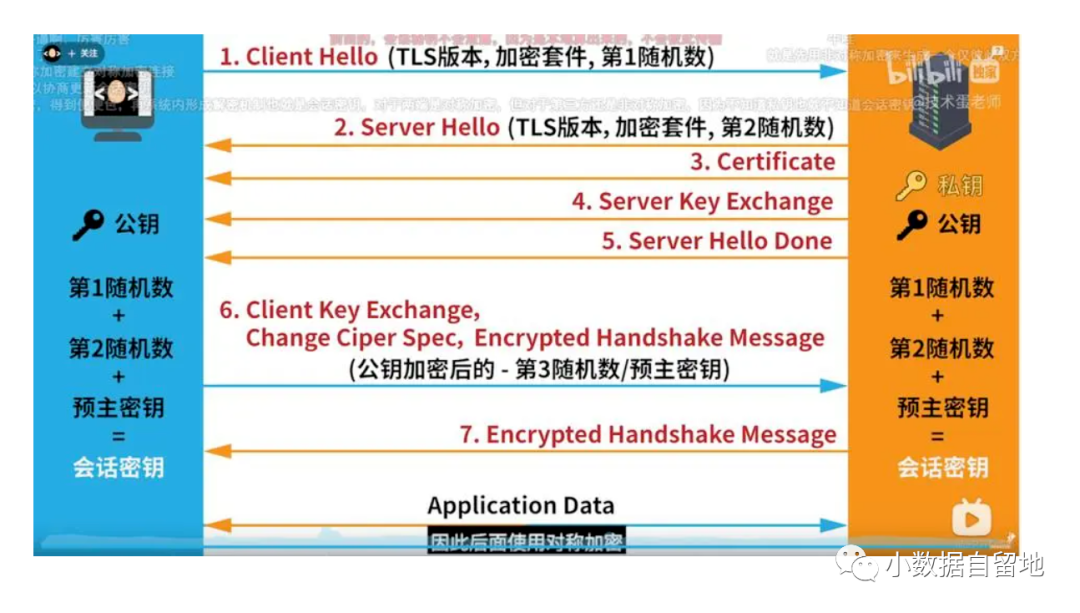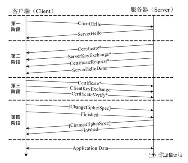 简单来说握手的过程就是client和server端互say hello,确定TLS版本,加密套件等信息后,然后交换证书,秘钥等信息,最后生成了后面应用层会使用到的秘钥。这个图实际上是一个最完整的握手流程,实际生产环境中比这个流程要简单的多,比如说大多数情况下,服务端并不会去验证客户端证书,有些java 客户端的默认配置甚至都不会去验证服务端的证书。下图将可选的步骤标记了*。