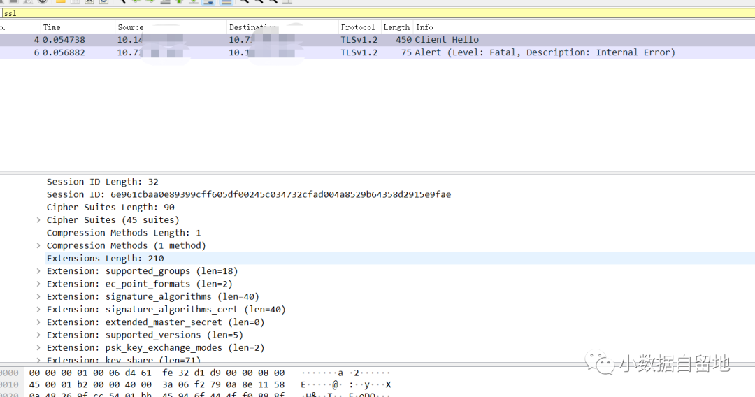 果然是在Client Hello的请求中没有SNI字段,在APISIX服务端直接返回了Fatal Internal error