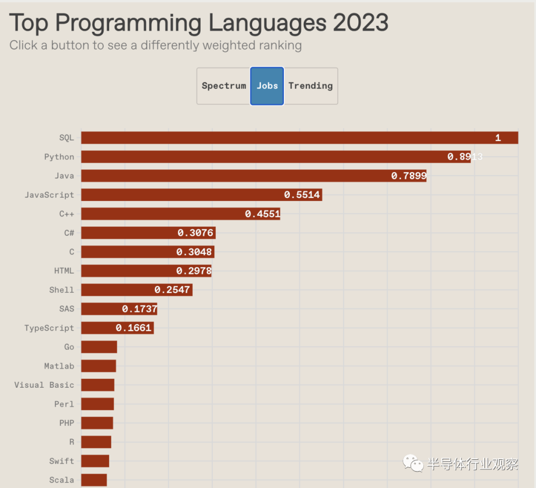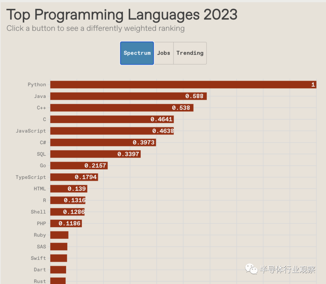 今年,Python不仅在我们的总体“Spectrum”排名中保持第一(该排名的权重反映了典型 IEEE 成员的利益),而且还扩大了领先优势。Python 日益增强的主导地位似乎很大程度上是以牺牲更小、更专业的语言为代价的。它已成为万能语言,并且是人工智能等领域的大师,强大而广泛的库使其无处不在。尽管高端计算的摩尔定律正在逐渐减弱,但低端微控制器仍然受益于性能提升,这意味着现在0.70 美元的 CPU上有足够的计算能力使 Python 成为嵌入式开发领域的竞争者,尽管解释器的开销很大。从长远来看,Python 也有望巩固其地位:许多儿童和青少年现在使用 Python编写他们的第一个游戏或闪烁他们的第一个 LED 。然后,他们可以使用相同的语言无缝地进入更高级的领域,甚至找到工作。