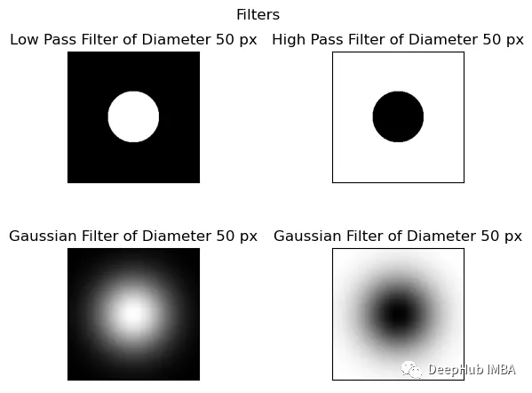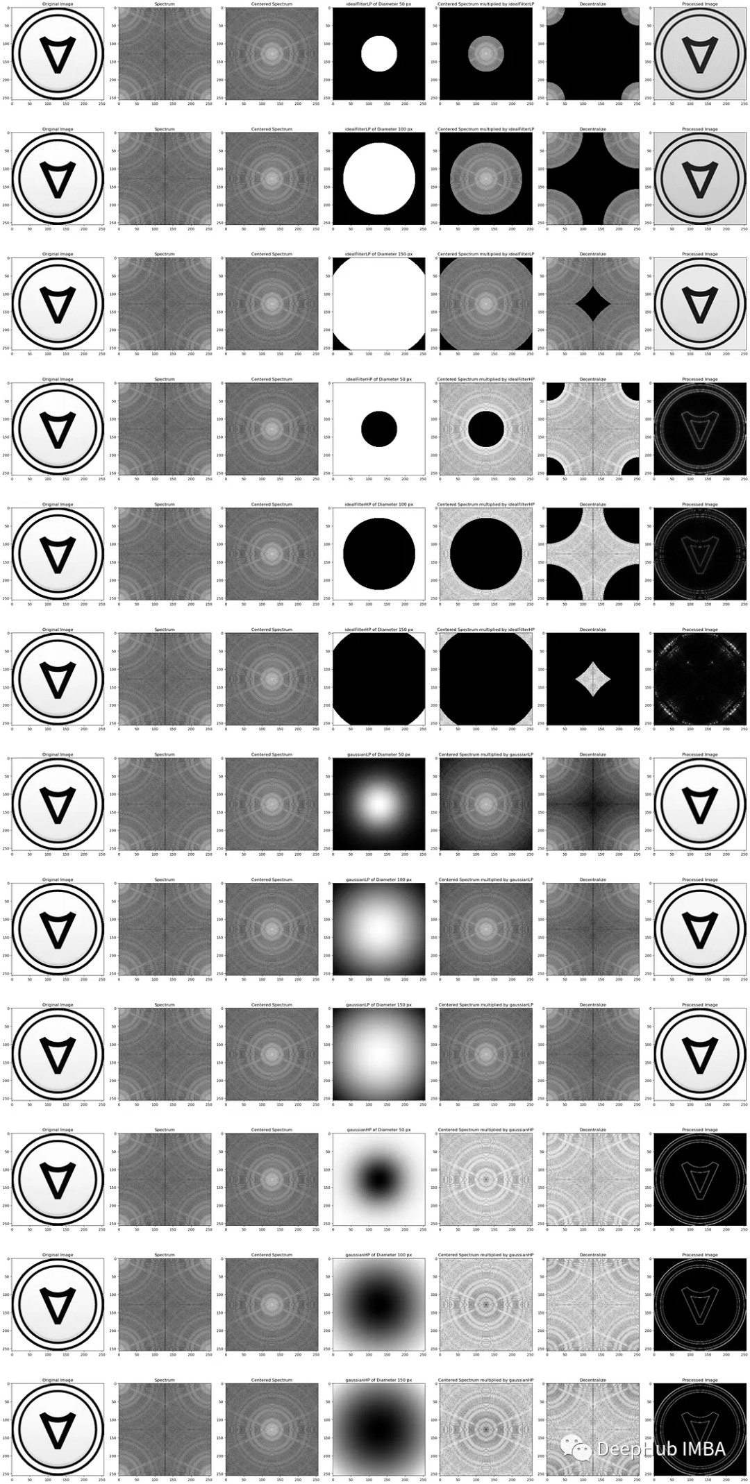 可以看到,当改变圆形掩膜的直径时,对图像清晰度的影响会有所不同。随着直径的增加,更多的频率被抑制,从而产生更平滑的图像和更少的细节。减小直径允许更多的频率通过,从而产生更清晰的图像和更多的细节。为了达到理想的效果,选择合适的直径是很重要的,因为使用太小的直径会导致过滤器不够有效,而使用太大的直径会导致丢失太多的细节。