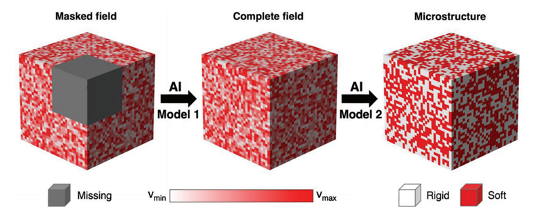 内容一览:材料检测在工程、科学及制造业中扮演着至关重要的角色。传统的材料检测方法,例如切割和化学试剂检测具有破坏性,同时较为耗费时间和资源。近期,MIT 科学家利用深度学习开发了一种技术,能够填补缺失信息,并进一步通过表面观察确定材料的内部结构。在数据处理时,经常遇到一种挑战,即从模糊的图像或部分信息中复原完整的图像。这种挑战被称为「逆问题」(inverse problem),它不仅在医学诊断中普遍存在,也在材料科学中频繁出现。如果我们能够有效地填补这些缺失的信息,就有可能更全面、更准确地理解生物组织或材料的性质,从而做出更精确的决策。如何无损检测材料内部的组织结构困扰着许多相关从业人员。无损检测指利用现代化技术和设备,在不损害或影响材料内部组织和使用性能的前提下,检测材料内部结构。虽然可以通过使用 X 射线等技术进行检测,但这些方法通常较为昂贵,并且需要庞大的设备。为此,MIT (麻省理工学院) 的中国博士生杨镇泽及 Markus Buehler 教授结合多种深度学习架构,在 2D 和 3D 的情况下,分别通过有限的信息恢复材料中的缺失部分,并进一步表征微观结构。目前,该研究成果已发表在《Advanced Materials》期刊上,标题为「Fill in the Blank: Transferrable Deep Learning Approaches to Recover Missing Physical Field Information」。该研究成果已发表在《Advanced Materials》https://onlinelibrary.wiley.com/doi/full/10.1002/adma.202301449下图展示了该研究的总体示意图。在左边的图中,灰色立方体为缺失的部分。在 2D 和 3D 情况下,分别有两个 AI 模型组合执行任务。研究人员训练第一个 AI 模型「填补空白」,从 masked field 中恢复 complete field,训练第二个 AI 模型「解谜」,将恢复的 complete field 作为输入,反向获得复合材料对应的微观结构 (Microstructure)。研究人员使用有限元分析 (Finite Element Analysis, FEA) 来计算特定条件下 2D 和 3D 复合材料的应变和应力场 (strain and stress fields)。在 2D 情况下,研究人员创建了对称的 8×8 网格,用于构建复合材料的几何形状(共 232 种可能的几何形状)。随后,随机生成了 1,000 种不同的复合材料微观结构用于单轴拉伸测试 (uniaxial tensile test)。在 3D 情况下,研究人员利用 2×4×4 网格创建了两层微观结构(共 232 种可能的几何形状),并使用 4×4×4 网格构建了 4 层复合材料(共 264 种可能的几何形状)。为了使可能几何形状的数量与 2D 情况相同,研究人员选择了 2×4×4 网格作为基准,并随机生成了 2,000 种不同的几何形状用于 FEA 计算。在 2D 情况下,通过使用 Abaqus 可视化工具,研究人员生成了从 FEA 中得到的应变和应力场图像,并使用白色和红色的条块进行表示。接着,通过 Python 预处理,进行剪切、调整大小和重新着色。预处理后的图像尺寸为 256×256。在复合材料几何图或微观结构中,红色块代表柔软材料,而白色块代表刚性材料。研究人员引入了规则和不规则形状的掩码,规则掩码是方形形状,大小从 96-128 不等。在 3D 情况下,研究人员收集了每个单元的应变和应力值 (strain and stress values),然后对其进行了归一化,形成一个 16×32×32×1 的矩阵。与 2D 情况类似,使用 Python 代码可视化应变和应力场的等值线。将一系列 field 图像存储在一个 16×32×32×3 的矩阵中,用作训练和测试深度学习模型的数据表示形式。相应的 3D 复合材料微观结构可视化通过 Matplotlib 库进行体积绘制。本研究采用了多种深度学习模型,包括生成对抗网络 (GAN)、基于 Transformer 的 ViViT 模型及卷积神经网络 (CNN)。- GAN: 在填补 2D 图像阶段,研究人员使用了 GAN 模型,该模型被称为 DeepFill 模型的第二版本,可以进行自由形式的图像修复。