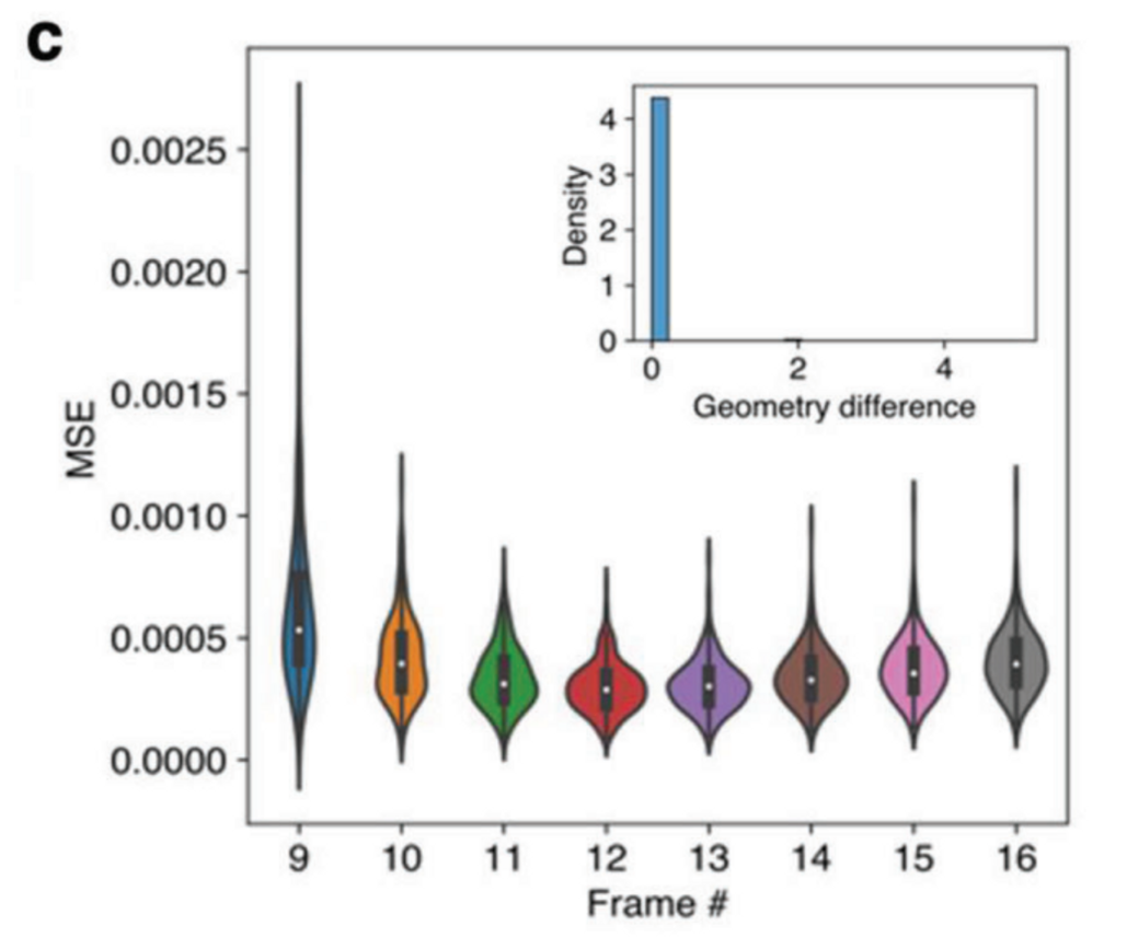 为了获得预测误差,研究人员绘制了预测应力平均值与掩码区域内实际值的散点图。掩码的形状随机生成。如下图 c 所示,给定 200 个测试数据的 R2 指标达到 0.998,表明 GAN 模型性能出色。c:GAN 模型在填补图像上的表现。Ground truth 与预测值显示出很高的一致性 (R2 = 0.998)。d:CNN 模型进行几何识别的性能。图中显示了 ground truth 与预测结果之间的 geometry difference 分布。此外,研究人员通过计算 geometry difference 来评估 CNN 模型在几何识别方面的性能。geometry difference 是真实序列和预测序列之间不同材料块的数量。如图 2d 所示,大多数预测序列与实际序列相同,所有 200 个测试数据中的最大 geometry difference 为 0.0625,32 个块 (block) 中有两个不同。如果恢复的 field 图像不准确,几何误差会增加。因此,CNN 模型的精确预测进一步验证了 GAN 模型的高性能。在实际工程实践中,3D 复合材料微观结构通常比 2D 情况更加复杂。下图展示了 8 个预测的 field frames 与 ground truth 的对比。结果显示,改进后的 ViViT 模型能够利用复合材料中的一层(第 1 至第 8 帧)的 mechanical fields,对另一层(第 9 至第 16 帧)的 field 进行准确预测。