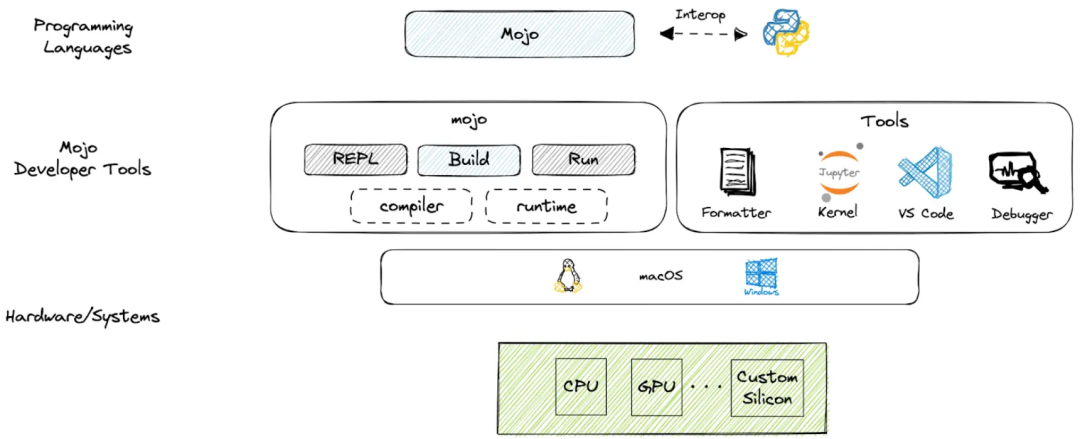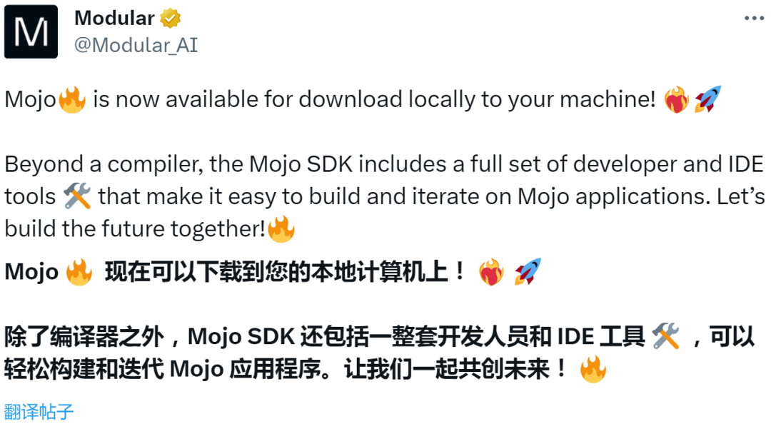 出品 | OSC开源社区(ID:oschina2013)Mojo 是 Modular AI 公司开发的新编程语言,它结合了 Python 的易用性以及 C 语言的可移植性和性能,目标是使其成为 AI 研究和生产的理想选择。Modular AI 是 Chris Lattner 和 Tim Davis 于 2022 年创立的公司,目标是自下而上重建全球 ML 基础设施。在这家新生的创业公司中,Chris Lattner 以 CEO 身份领导团队。Chris Lattner 毕业于波特兰大学的计算机科学系,具有创建和领导多个知名大型项目的经验,其中包括 LLVM、Clang、MLIR 和 CIRCT 等编译器基础设施项目,他还带头创建了 Swift 编程语言。从 2005 年 7 月到 2017 年 1 月间,他曾领导苹果的开发者工具部门,随后,曾短暂领导过特斯拉的自动驾驶团队。2017 年 8 月,Chris Lattner 在 Google Brain 团队领导了 TensorFlow 基础设施工作,包括一系列硬件支持(CPU、GPU、TPU),底层运行时和编程语言工作。今年 5 月,Modular AI 向外界公布了 Mojo。据称自 Mojo 亮相以来,超过 12 万开发者注册使用了 Mojo Playground,另外还有 19 万开发者参与 Discord 与 GitHub 讨论。Modular AI 公司更是在上月底宣布融资 1 亿美元。9 月 7 日,Modular AI 宣布 Mojo 正式开放下载,这意味着开发者可以在本地使用 Mojo 进行开发 —— 目前仅支持 Linux,官方表示会尽快推出 Mac 和 Windows 版本。根据公告,官方提供了编译器和 Mojo SDK。其中 Mojo SDK 还包括全套开发者和 IDE 工具 ,用于轻松构建和迭代 Mojo 应用程序。mojo 驱动:提供 shell 用于 read-eval-print-loop 或 REPL 的 shell,支持构建和运行 Mojo 程序、打包 Mojo 模块(包括对 🔥 扩展的支持)、生成文档和格式化代码
