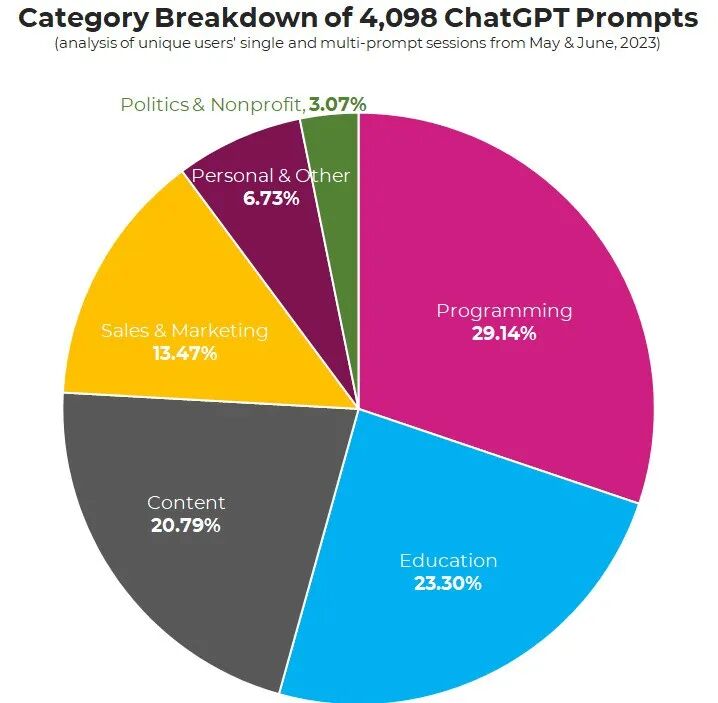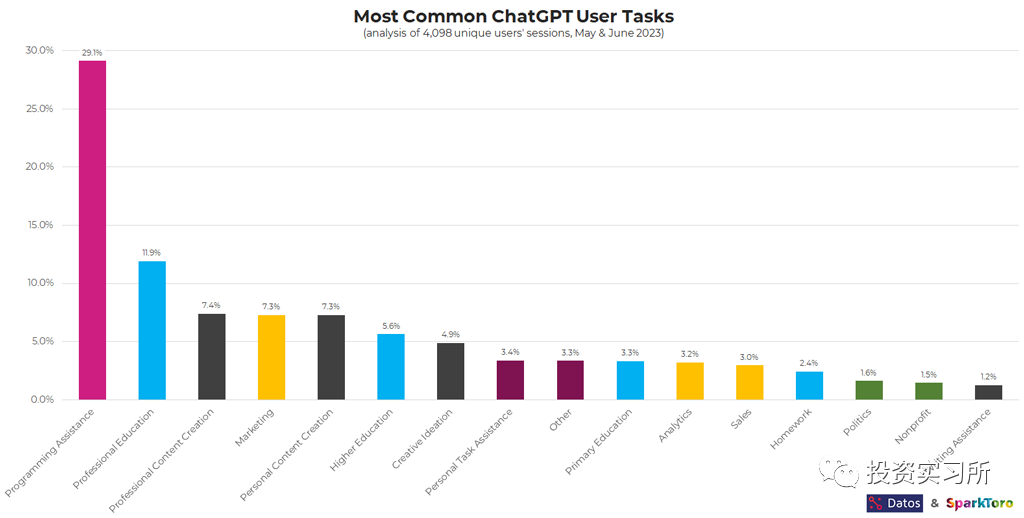 如果再细分的看这些用户都拿 ChatGPT 做啥,可以看到最大的几个应用场景: