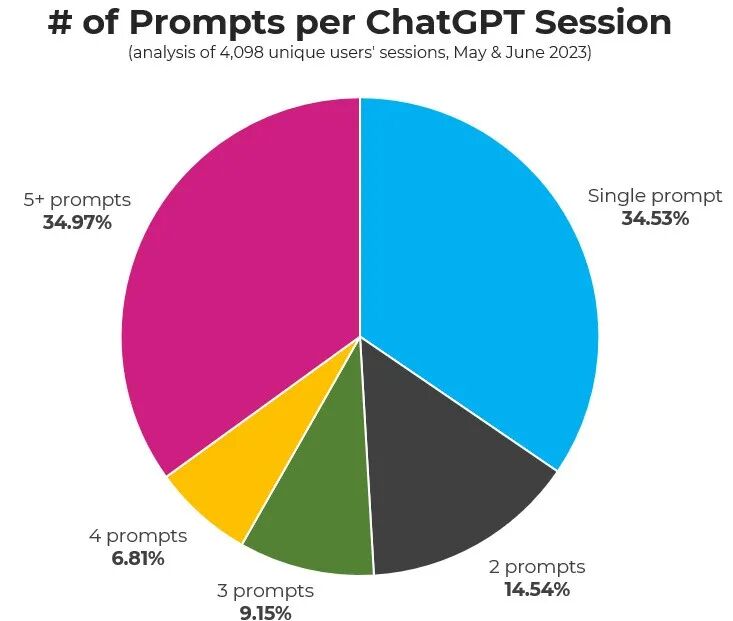 对于第二个假设,Datos 通过对 7000 多个真实 ChatGPT 用户做了一个更加细致的数据统计,筛掉一些不靠谱的用户后得到了 4098 个最真实的用户数据,下图是使用 prompt 量的一个统计数据,使用 5 个或者以上或者仅使用 1 个 prompt 的占据了快 70%。