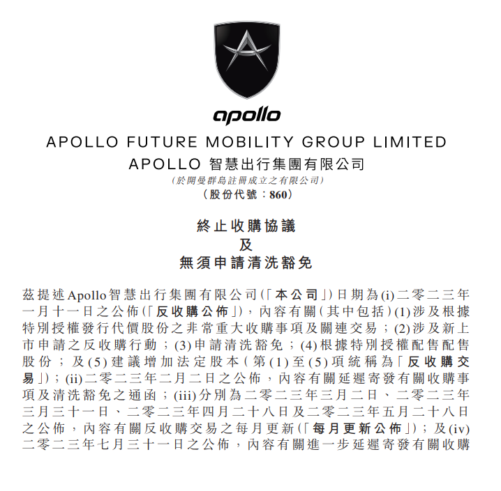 【Apollo出行放弃收购威马,终止20亿美元收购协议】Apollo出行周五在香港交易所公告称,相关各方已同意终止收购协议,因此收购事项及配售事项将不会进行。公告提及终止收购的原因包括,金融市场氛围持续不确定以及疫情后短期经济复苏等商业因素。(新京报)