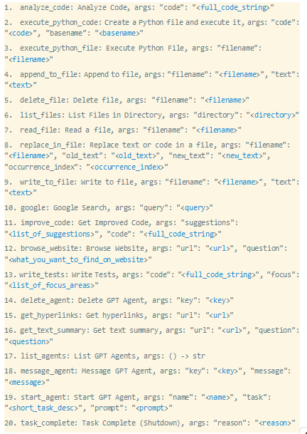 预定义的“命令”是允许纯基于文本的LLM在其执行环境和连接的网络中发挥更大作用的接口,例如浏览和总结网站(browse_website)、编写文件(write_to_file)或执行python代码(execute_python_code, execute_python_file)。
