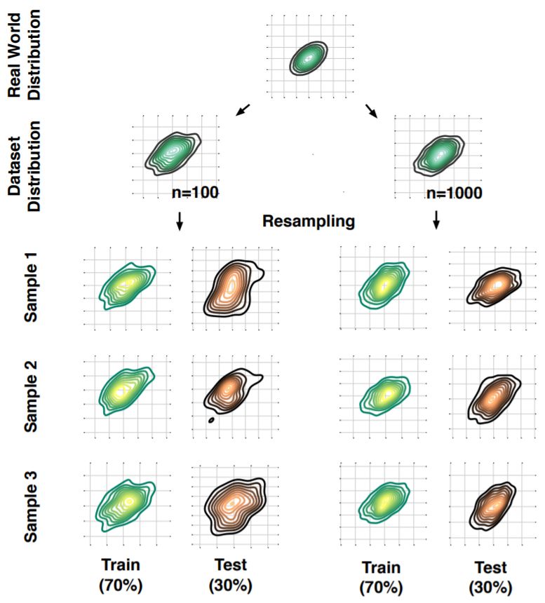 我们当然希望尽可能精确地预测模型的泛化性能。然而,本文的一个要点就是,如果偏差对所有模型的影响是等价的,那么偏差性能评估基本可以完美地进行模型选择和算法选择。如果要用排序选择最优的模型或算法,我们只需要知道它们的相对性能就可以了。例如,如果所有的性能评估都是有偏差的,并且低估了它们的性能(10%),这不会影响最终的排序。更具体地说,如果我们得到如下三个模型,这些模型的预测准确率如下:M2: 75% > M1: 70% > M3: 65如果我们添加了 10% 的性能偏差(低估),则三种模型的排序没有发生改变:M2: 65% > M1: 60% > M3: 55%. 但是,注意如果最佳模型(M2)的泛化准确率是 65%,很明显这个精度是非常低的。评估模型的绝对性能可能是机器学习中最难的任务之一。本章介绍一些用于模型评估的高级技术。我们首先讨论用来评估模型性能不确定性和模型方差、稳定性的技术。之后我们将介绍交叉验证方法用于模型选择。如第一章所述,关于我们为什么要关心模型评估,存在三个相关但不同的任务或原因。我们想评估泛化准确度,即模型在未见数据上的预测性能。