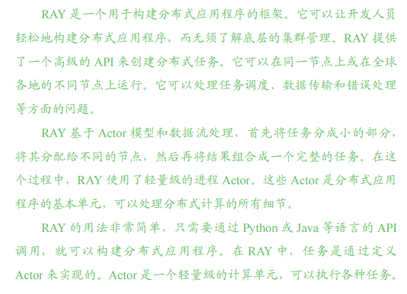 在学习新的库、框架、算法等技术时,使用 ChatGPT 我们可以快速了解其实现原理和用法,从而提高学习效率。例如,如果我们想要学习RAY 框架,那么如何快速学习呢?我们可以在 ChatGPT 中输入如下内容。