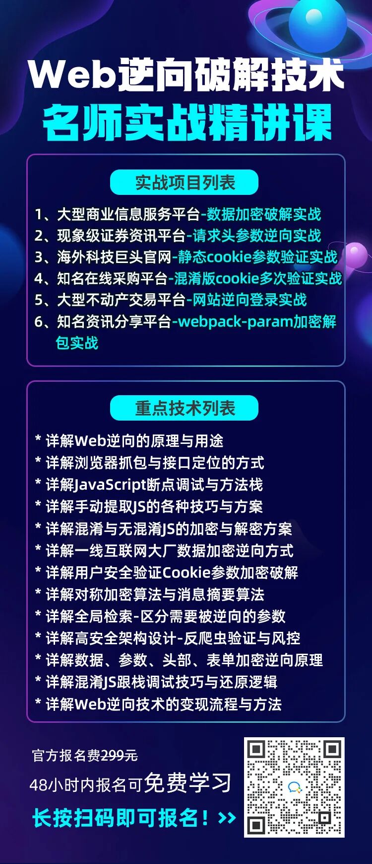 官方特训费299元,本号粉丝有福利,立即报名可免费学习!这是一套专讲Web逆向攻防的高阶技术实战课,迄今为止已帮助近三万学员快速进阶。本次课程将由国际大数据竞赛获奖大佬亲身指导,带领大家进行一线大厂高阶技术体系+Web逆向攻防实战+技术变现路径指导的综合速成训练!此次实战训练分为三节课程,是专为高阶爬虫技术速成而设计的,课程内包含多项业界难觅的真实项目,对应每一项案例都有保姆级的拆分详解,深入浅出极易学懂。