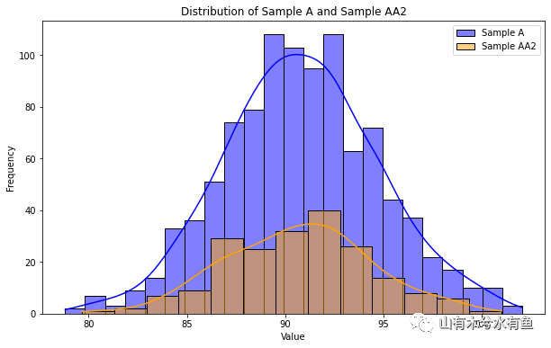, 6 )) sns.histplot(sample_A, kde=True , color='blue' , label='Sample A' ) sns.histplot(sample_AA1, kde=True , color='orange' , label='Sample AA1' ) plt.xlabel('Value' ) plt.ylabel('Frequency' ) plt.title('Distribution of Sample A and Sample AA' ) plt.legend() plt.show()