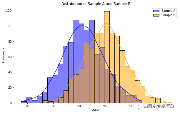 import seaborn as snsimport matplotlib.pyplot as plt# 绘制 sample_A 和 sample_B 的分布曲线图 plt.figure(figsize=(10 , 6 )) sns.histplot(sample_A, kde=True , color='blue' , label='Sample A' ) sns.histplot(sample_B, kde=True , color='orange' , label='Sample B' ) plt.xlabel('Value' ) plt.ylabel('Frequency' ) plt.title('Distribution of Sample A and Sample B' ) plt.legend() plt.show()