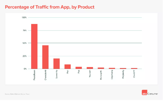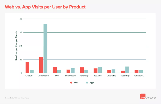 这里有 3 个值得注意的例外情况:专业消费级设计工作室 PhotoRoom(移动流量占总流量的 88%)、陪伴类应用 CharacterAI(移动流量占总流量的 46%)和文本转语音产品 Speechify(移动流量占总流量的 20%)。与网站相比,这些厂商的移动应用参与度(按每访问者每月的会话数量来衡量)明显高于平均水平。