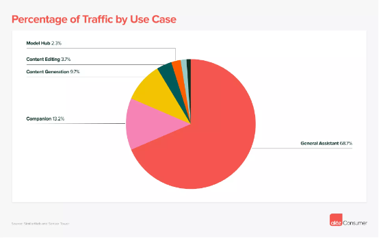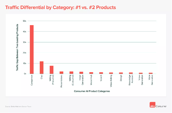 另外,流量分布也呈现出严重的碎片化趋势。专为特定用例或工作流程所构建的产品正与通用型工具齐头并进,两类定位下的产品都有可能支撑起可观的商业成功。