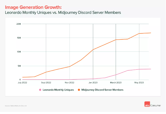 首先来看图像生成领域。虽然 Midjourney 在整体上占据主导地位,但像 Leonardo 这类专注于游戏资产生成的厂商也获得了惊人的流量增长。从下图中可以看到,Leonardo 每月独立访客的数量与 Midjourney 的 Discord 服务器成员增幅差距并不算太大。尽管前者受众已达千万,但 Leonardo 仍能跟上 Midjourney 的增长速度并维持住百万级用户规模。