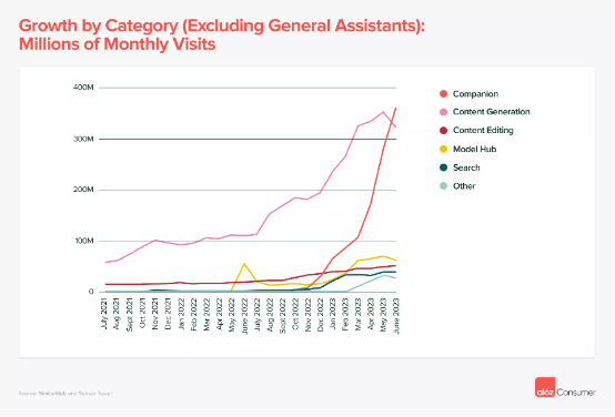 但最近几个月来,另外两大应用类别也开始异军突起——这就是 AI 伴侣(例如 CharacterAI)和内容生成工具(例如 Midjourney 和 ElevenLabs)。在更广泛的内容生成类应用中,图像生成是最主要的用例,占得总体流量的 41%;其次是生产 / 消费侧写作工具,占比 26%;视频生成则占比约 7%。