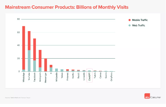 而且即使是体量最大的生成式 AI 产品,在与主流消费级服务对抗时,规模仍显得有些不够看。将 Web 与移动端流量做综合考量,ChatGPT 的排名大致跟 Reddit、LinkedIn 和 Twitch 在一个水平上,仍远低于各大业界“巨头”(例如 WhatsApp、YouTube 和 Facebook 等)。