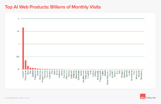 ChatGPT 一家就独占前 50 大生成式 AI 产品月度流量的 60%,估计每月访问量为 16 亿次、月度活跃用户为 2 亿(截至 2023 年 6 月)。如此亮眼的成绩,甚至令 ChatGPT 网站在全球访问量榜单上排名第 24 位。