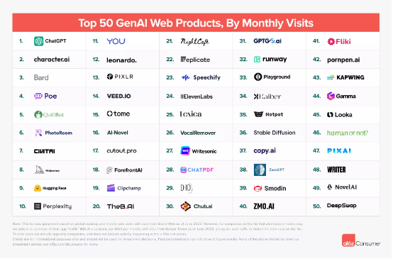 为了回答这些问题,技术媒体 a16z 参考了 LikeWeb 流量数据(截至 2023 年 6 月),按月度访问量对前 50 大生成式 AI Web 产品进行排名。此外,他们还分析了这些产品随时间推移的增长趋势,并跟踪这种增长来自何处。