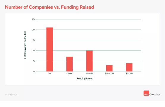 而且最重要的是,目前消费者们的付费意愿明显相当强烈。榜单上 90% 的公司已经实现了盈利,且几乎所有厂商均依靠订阅模式获取收益。还有 15% 的上榜企业已经筹集到至少 5000 万美元资本!